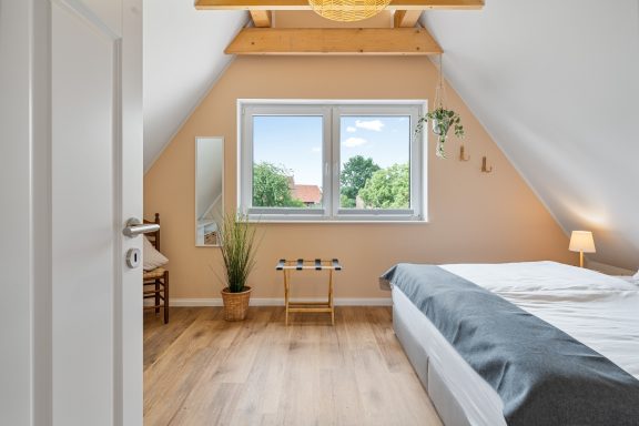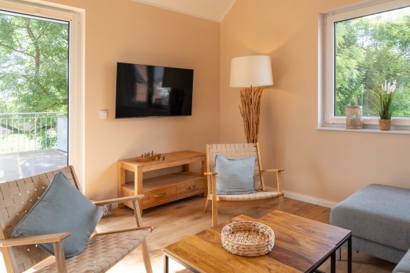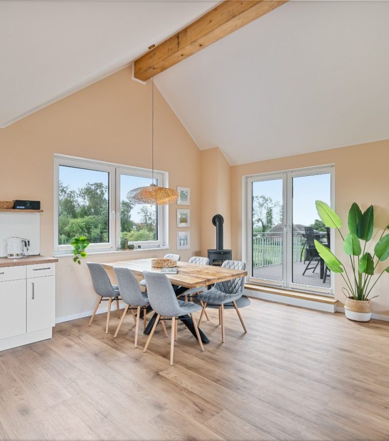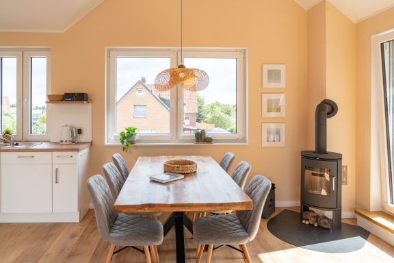 Die charmante 94 qm große, geräumige Ferienwohnung "Lüheblick" hat 3 Schlafzimmer und bietet Platz für 6 Erwachsene oder 5 Erwachsene + 2 Kinder. Die im Sommer 2025 fertiggestellte Fewo liegt im Obergeschoss. Die helle, gemütlich eingerichtete Wohnung verfügt über eine große Dachterrasse, von der Sie einen fantastischem Blick auf die in wenigen Metern vorbeifließende Lühe haben. Sie ist modern und voll ausgestattet. In der kalten Jahreszeit bietet ein Kaminofen zusätzliche Gemütlichkeit und Wärme.