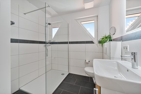- 1 Badezimmer mit Dusche, WC, Waschtisch mit Föhn und Handseife