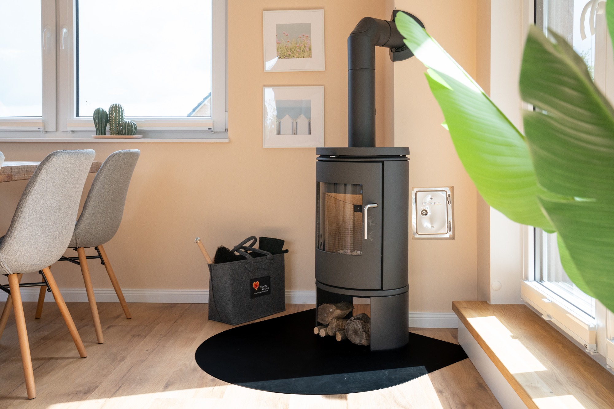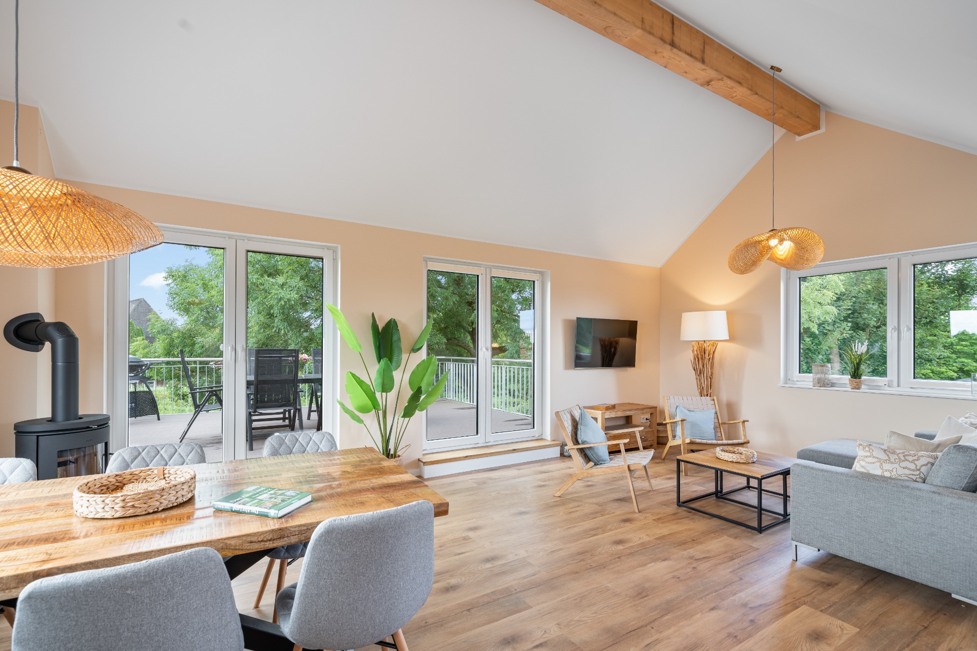- großer heller Wohnraum mit offener Küche, Smart-TV, Radio, Kaminofen und Zugang zur Dachterrasse