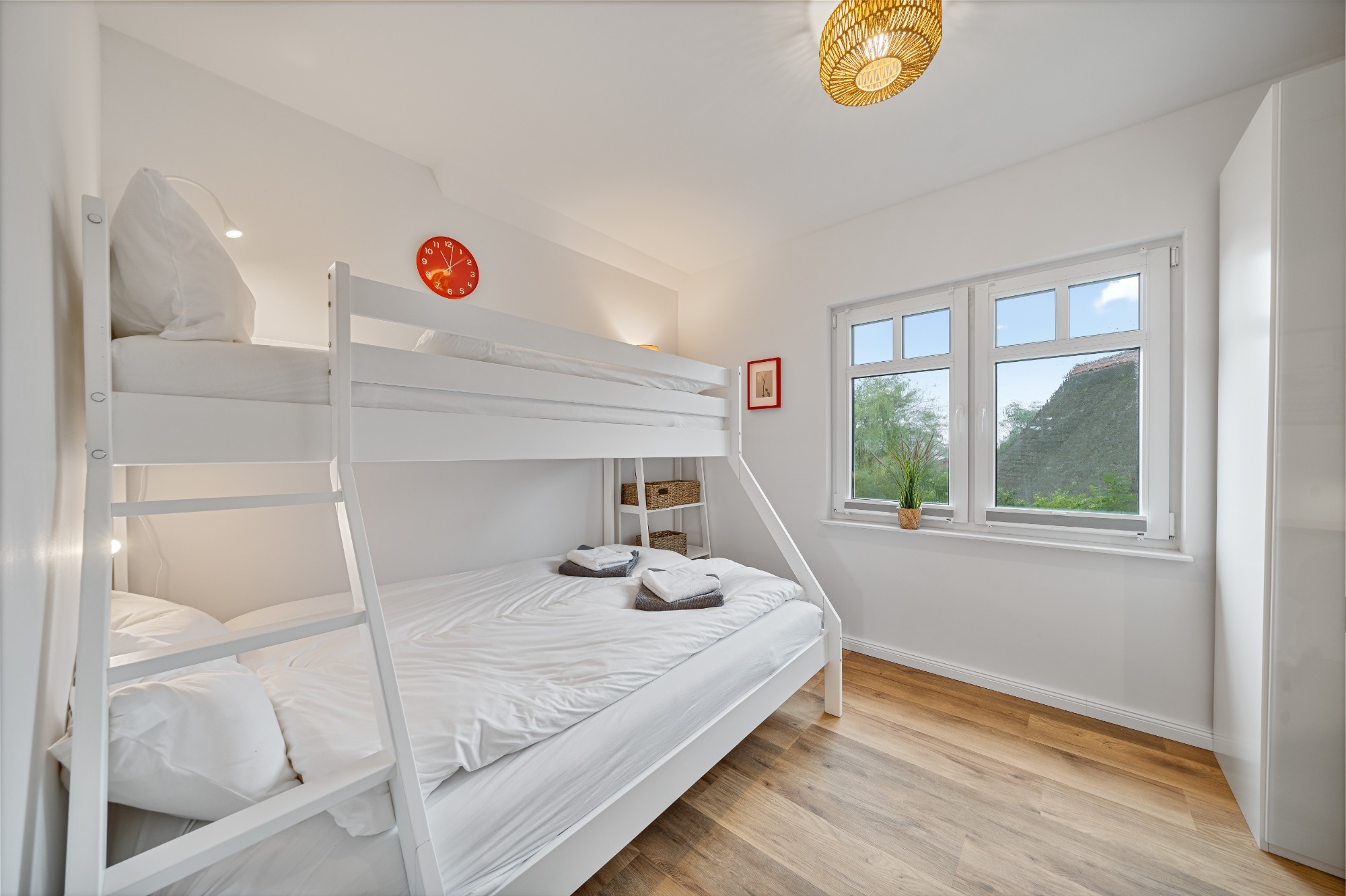 - Schlafzimmer 2: Etagenbett (oben 90x200, unten 140x200), Verdunkelungsplissees